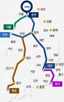 목포→ 호남고속도로 → 중부고속도로 → 호법 IC → 영동고속도로 → 만종 IC → 중앙고속도로 → 춘천 IC → 춘천
